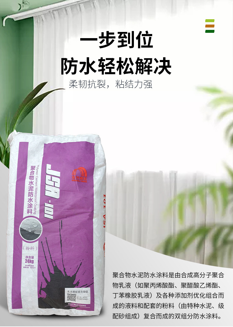 东方雨虹防水聚合物水泥JSA-101 是采用聚合物水泥防水涂料合成分子聚合物乳液及各种添加剂优化组合而成液料和配套粉料 复合而成的双组份防水涂料 具有效防水防潮防霉等特点