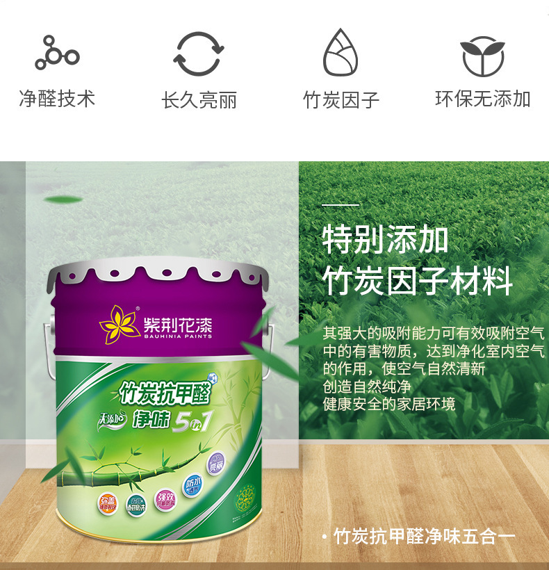 特色服务 : | 厂家负责施工技术指导 | 竹炭净味五合一墙面漆 : | 竹碳净味白色环保内墙面漆 |