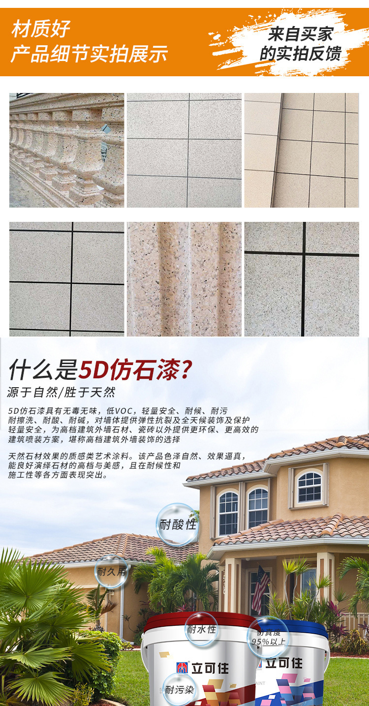 立可住仿石漆水泡水 外墙水包水多彩仿大理石漆 是采用天然石材经现代工艺精细加工而成 具有无毒无味 耐擦洗 耐酸碱 耐候 耐污染等特点 适用于高挡小区 别墅外墙装饰 欢迎新老顾客前来订购