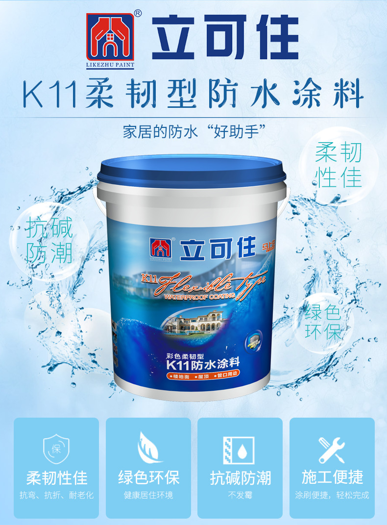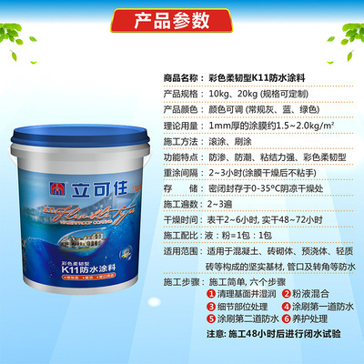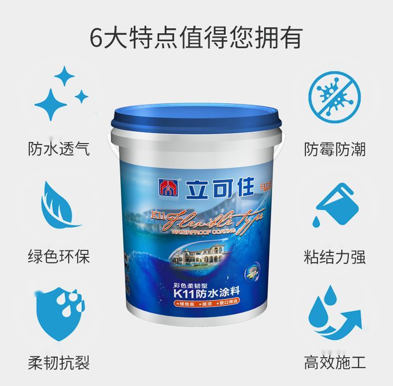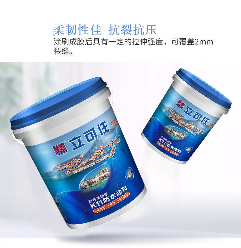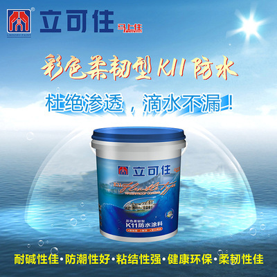 立可住彩色柔韧型K11防水涂料 是采用高分子聚合物改性水泥无机防水材料组成一种双组份复合渗透性强的防水涂料 具有抗碱防潮 防霉 柔韧抗裂 等特点 欢迎新老顾客前来订购