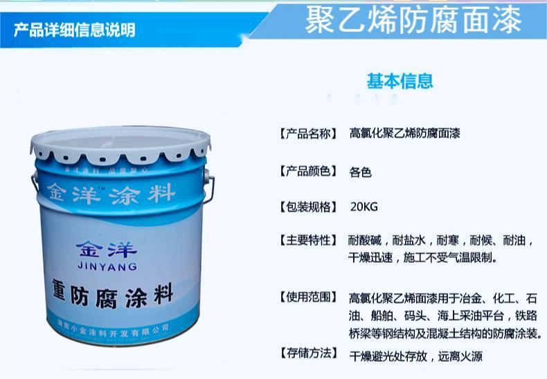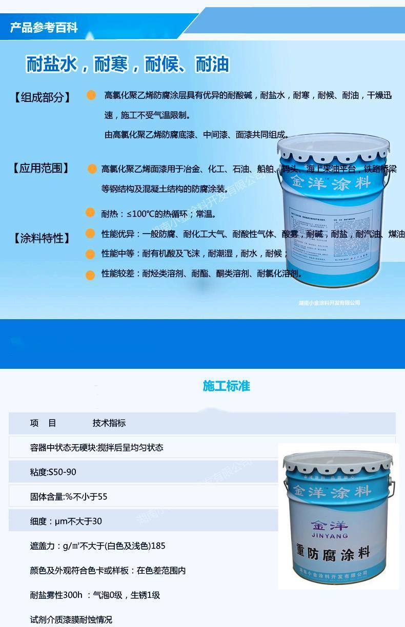 金洋银色高氯化聚乙烯防腐面漆 底漆 中漆共同组成 适用于钢结构 混凝土的结构防腐涂装 适用范围冶金 化工 石油铁路桥梁等钢结构 具有耐酸碱 耐盐水 耐寒耐候 耐油等 在施工中不受气温限制等优点 欢迎订购