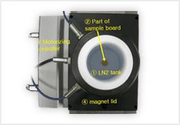 样品变温、固定部分组成 - 圆形液氮槽 - 样品固定板 - 温度传感器 - 嵌入式加热器 - 磁体盖 - 电缆 | AMP磁体Kit俯视图 - 磁体移动马达控制 - 圆形液氮槽 - 磁体盖 - 电缆 |