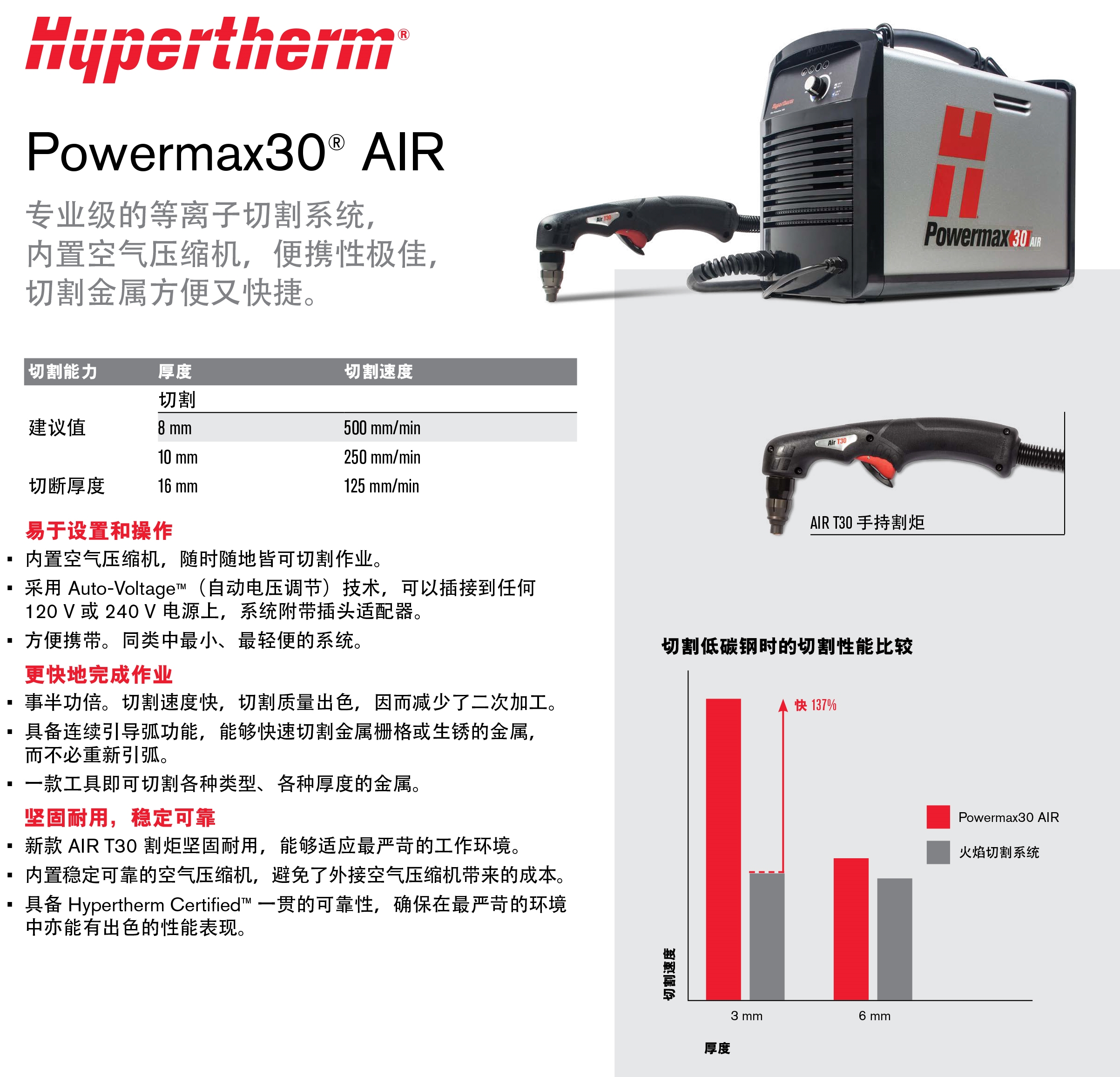 Powermax30® AIR 小块头,却有大能量。它是小巧轻便的手持等离子切割系统,配备有自己的内置空气压缩机,您可以在有单相电源的任何地方使用 Powermax30 AIR。只需插上电源并连接工件夹,即可开始切割。