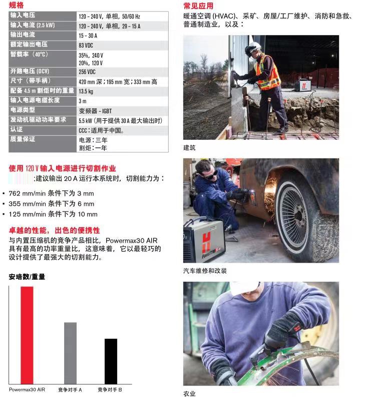 海宝Powermax30® AIR 体积小巧bai,方便携带,du性能出色。海宝Powermax30 AIR 内置空气压缩机,是zhi同类系统中体积小、重量轻的dao手持等离子切割系统,您可以将系统带到工件所在位置,而无需将工件带到系统所在位置。由于其便携性好,该系统可广泛应用于各种切割应用领域。此外,该系统的安装和操作都非常简单。您可以将该系统插接到任何 120–240 V 单相电源上。