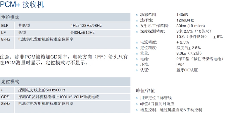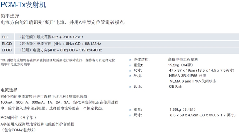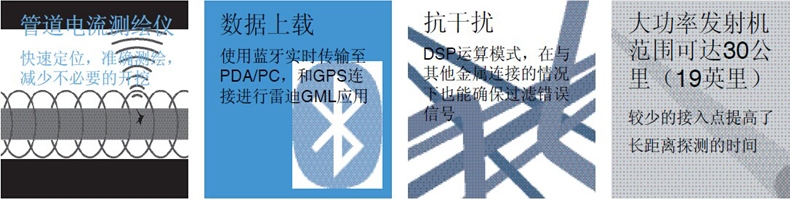 PCM +系统包括一个便携式发射机及手持式接收机。发射机和CPS站点连接,可以向管道施加一个特殊的近直流信号。