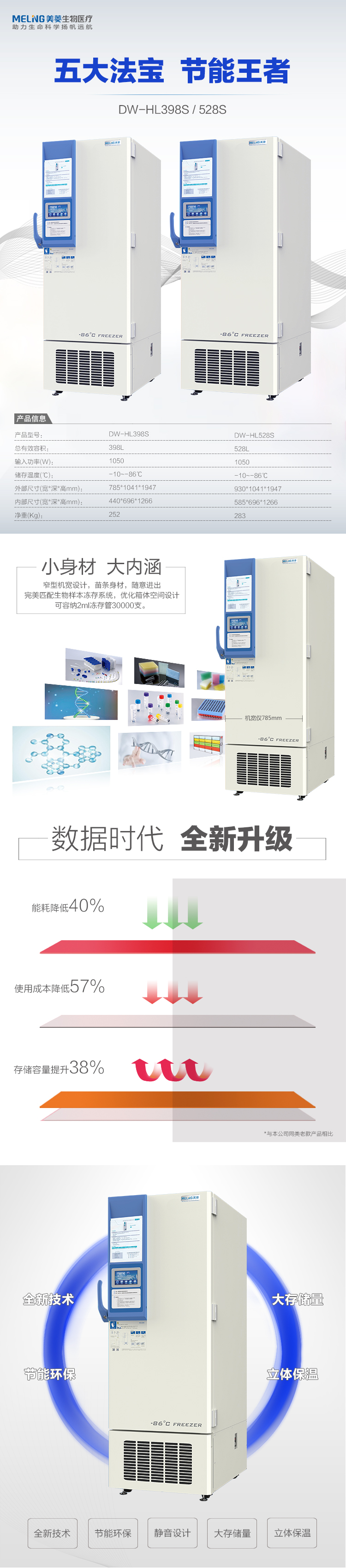 超低温冷冻存储箱DW-HL398S型号:DW-HL398S外型尺寸(宽*深*高)mm:785*1041*1947总有效容积(升):398存储温度(℃):-10℃~ -86℃重量(kg):252