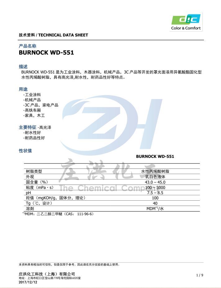 WD-551日本DIC水性树脂   水性聚氨酯   羟基丙烯酸   水性工业漆   水性木器漆  庄