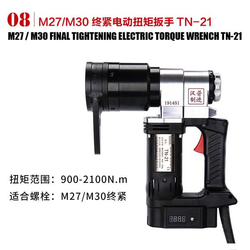 山东汉普M27/M30终紧电动扭矩扳手TN-21主要用于桥梁钢结构螺栓的终紧作业。紧固与拆卸,合理控制扭矩,保证质量安全。德国进口电机,功率大、体积小、寿命长,德国日本进口轴承,性能可靠性更好,锻造铝合金构件,坚固耐用、稳定性强,数控显示器,重复精度高。轻巧灵活,精确扭力。采用数显控制器,扭矩控制精度高,重复精度高达±3%,整体体积小、重量轻,操作简单,携带方便,当操作达到预设扭力值时,扳手会自动停止运转。