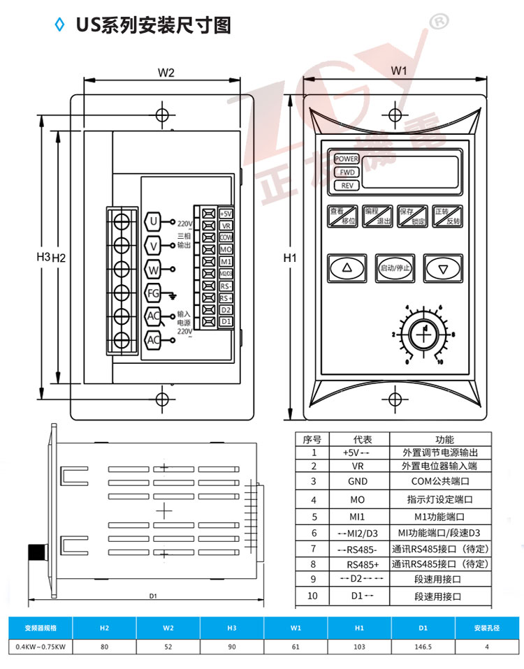 US系列通用简易微型变频器单相进三相220V出200W400W750W调速器