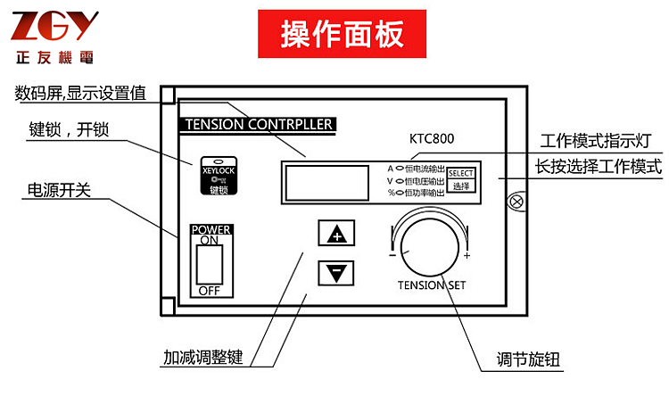 KTC800A手动张力控制器,由高速微处理器和大功率开关电源构成,可工作于恒流,恒压,恒功率(恒扭矩)等三种模式,能自动补偿离合器/制动器的热衰减,力矩输出稳定可靠。最大输出电流可达4A。KTC800A手动张力控制器可以方便实现薄膜印刷加工,绕线机等需要控制张力机器的高精度稳定控制。