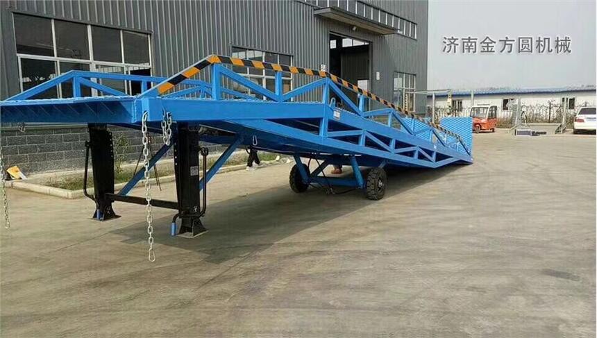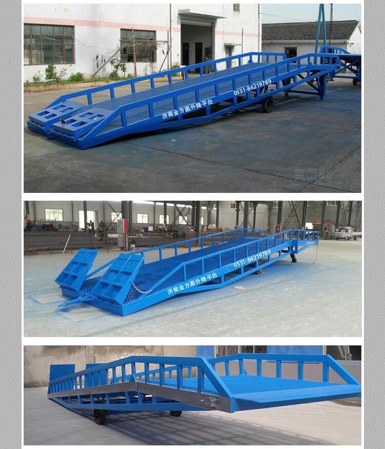 移动液压登车桥是实现货物快速装卸的专用辅助设备,它的高度调节功能使货车与库房的货台之间架起一座桥梁,叉车等搬运车辆通过它能直接驶入货车内部进行货物的批量装卸,仅需单人作业,即可实现货物的快速装卸。移动液压登车桥使企业减少大量劳力,提高工作效率,获取更大经济效益。台面均设计为网格状钢板,这种结构能保证具有很好的强度,又具有防滑功能,还能方便地清扫工作台面,使它能经常地保持清洁、美观。移动液压登车桥无须外接电源,通过手摇泵做动力能轻松地在其整个调整范围内按50mm的倍数进行高度的调整。可以充分适应各种不同高度的货车.