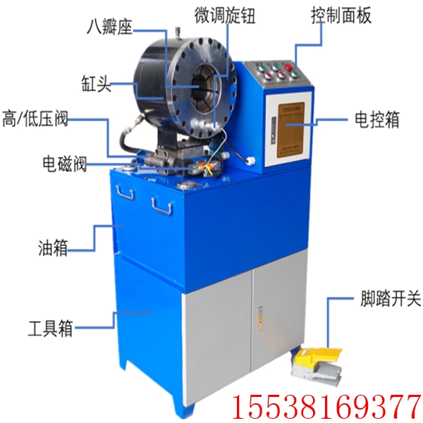 套头机是一种用于扣压管件总成的液压设备,其将所配套的金属接头通过扣压机的模具施加收缩力,将金属接头牢固的扣压在所配套的工程机械用高压油管或汽车上的刹车管、机油管、空调管、动力管上。扣压机适用于各类机械高低压油管、气管、水管、电缆接头、汽车空调管、汽车动力转向管、机油管、汽油供油管,以及建筑配件、日用热水气管的扣压,广泛用于车辆、工程机械、液压机械、焊割设备等行业。