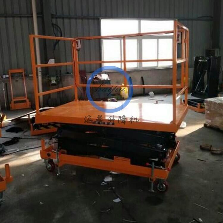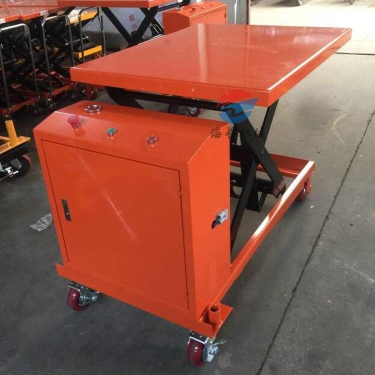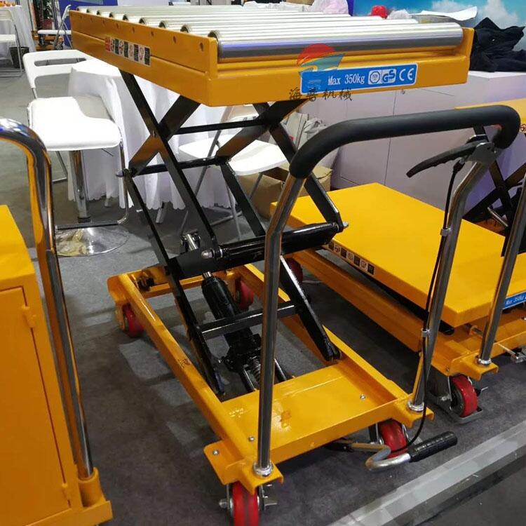 平台下降控制为旋扭或扳手控制,额定装载量分别有300 kg,350kg,500kg,800kg,1000kg五种,最高升高度有880、1300、1400、1500mm等,踏动塌脚杆操纵油泵,使工作台面平稳上升。操纵控制旋钮或向上提升扳手,使工作台面平稳下降, 车架底部配有万向轮,可向任意方向旋转,操作灵活简便。