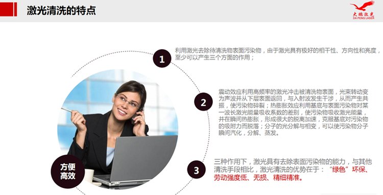 1.激光清洗是一种”绿色”的清洗方法,不需使用任何化学药剂和清洗液,清洗下来的废料基本上都是固体粉末,体积小,易于存放,可回收,可以轻易解决化学清洗带来的环境污染问题;