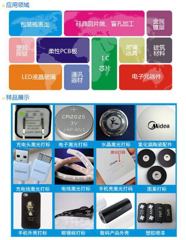 普通消费者可见的电子产品的标识应用更多的来自于电子产品的塑料外壳、适配器或数据线,如电源组、插头等产品的商标、标识、规格等信息,耳机或适配器上的商标等,这类塑料制品一般采用油墨印刷或光纤激光打标机加工,但现在越来越多的客户选择了紫外激光打标机来代替。