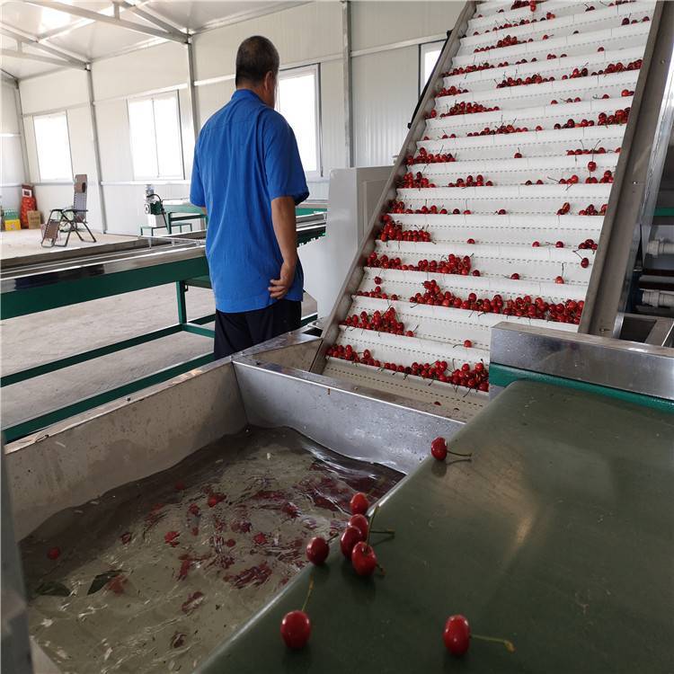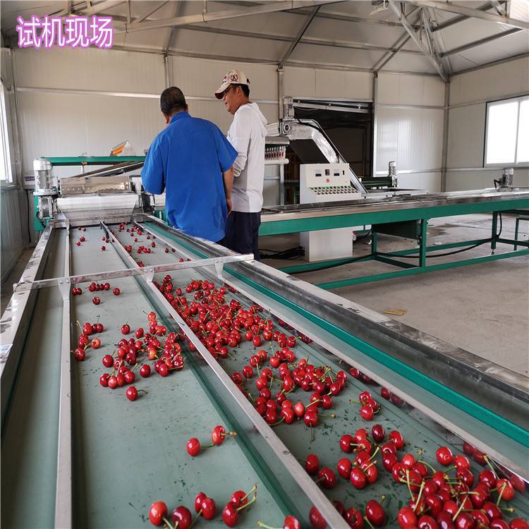 分级后樱桃大小均匀整齐,装箱后商品 ,分选的同时将次果进行剔除,使樱桃品质一致。分级后的樱桃便于根据不同的目标客户有针对性的进行市场投放。利用机械分级樱桃,采用水包膜技术对樱桃无损伤分级,在分级过程中可以对樱桃果实进行冷水降温处理, 樱桃的新鲜度不被破坏。