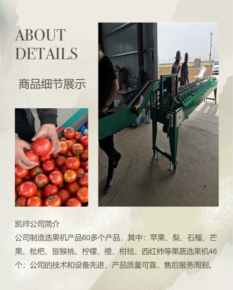 西红柿重量分选设备移动方便,既可以在选果场用,也可以安放在村镇或果园里进行水果分级,减少水果因搬运造成的碰刺伤,提高商品率。