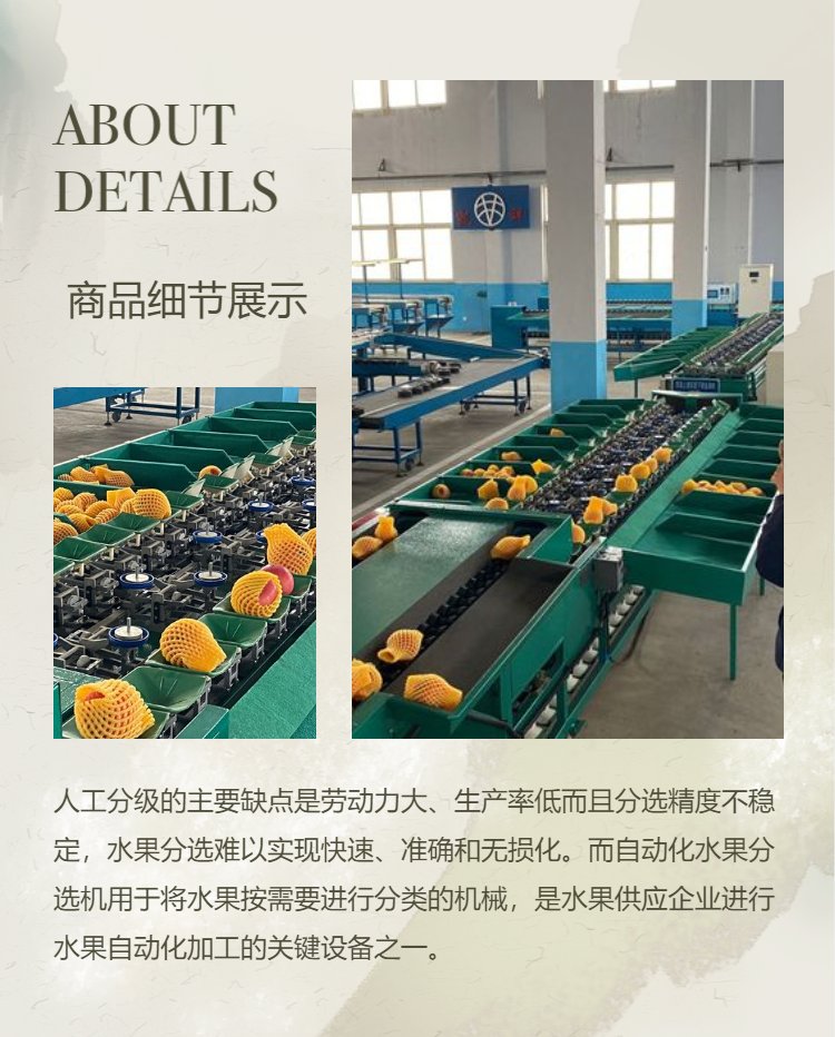 用途:用于苹果、梨、桃、石榴、柑桔、猕猴桃、脐橙、西红柿、柠檬、台湾青枣、百香果、人参果、火龙果、柿子、圆葱、枇杷等果蔬球形果实重量分级