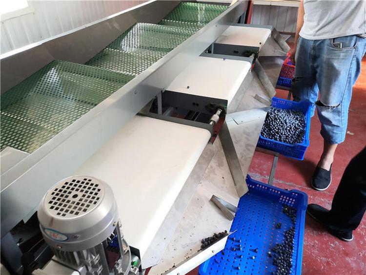 新型蓝莓选果机、蓝莓分选机在代蓝莓分选机的基础上进行改进,更贴合蓝莓本身果粉在分选的过程易受损的特点。通过低高度传输皮带对已分选出的蓝莓进行传输,保护蓝莓的花青素不受损伤,延长蓝莓的保鲜期。??