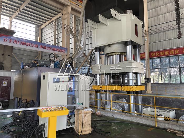 2000吨四梁四柱液压机是山东威力重工设计生产的一款粉末成型液压机、薄板拉伸液压机等,本机主要由石墨坩埚压制成型,是客户常采购的2000吨石墨坩埚液压机,是分为主机、液压传动装置和电气控制装置三部分组成,具有独立的液压传动装置和电气控制箱,可以在操纵台集中控制,实现调整、手动和半自动循环三种操作规范,本机的工作压力、工作速度、行程范围等可根据工艺需要进行调节,并能完成顶出和拉伸、模压等工艺。
