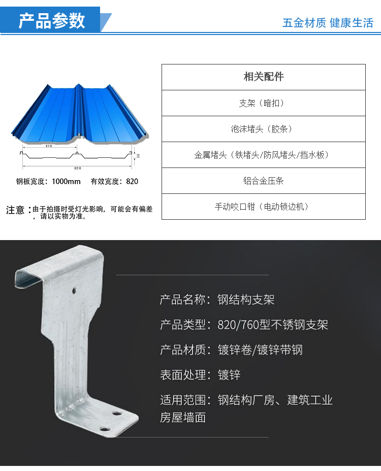晟泰钢结构820型支架彩钢瓦角驰暗扣型号加厚加高