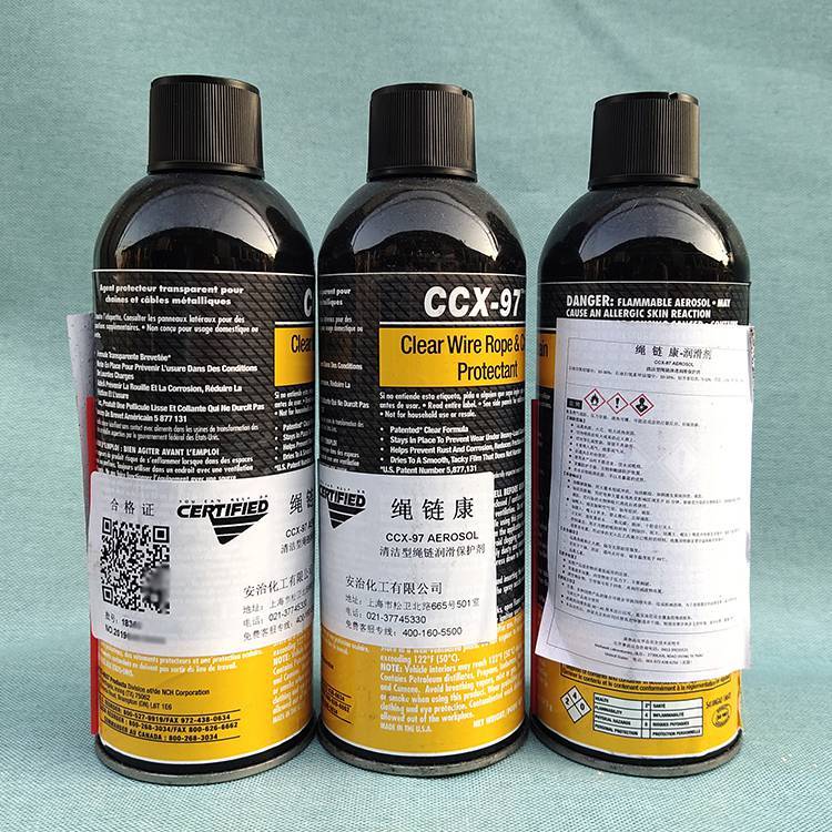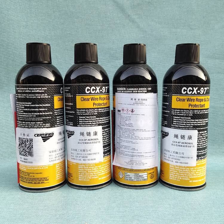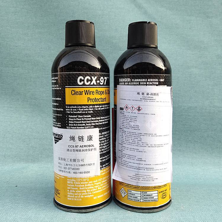 绳链康CCX-97绳链渗透润滑保护剂。清洁、环保型配方。内含有可溶性有机钼SOLUMOL 添加剂,有机钼保护层会进入绳索的丝股之间和链条的链轴和轴套联接处,减少摩擦和磨损,在高温、磨损、拉伸的情况下对金属起到保护作用,延长绳、链寿命。连续使用温度范围-20℃-100℃。