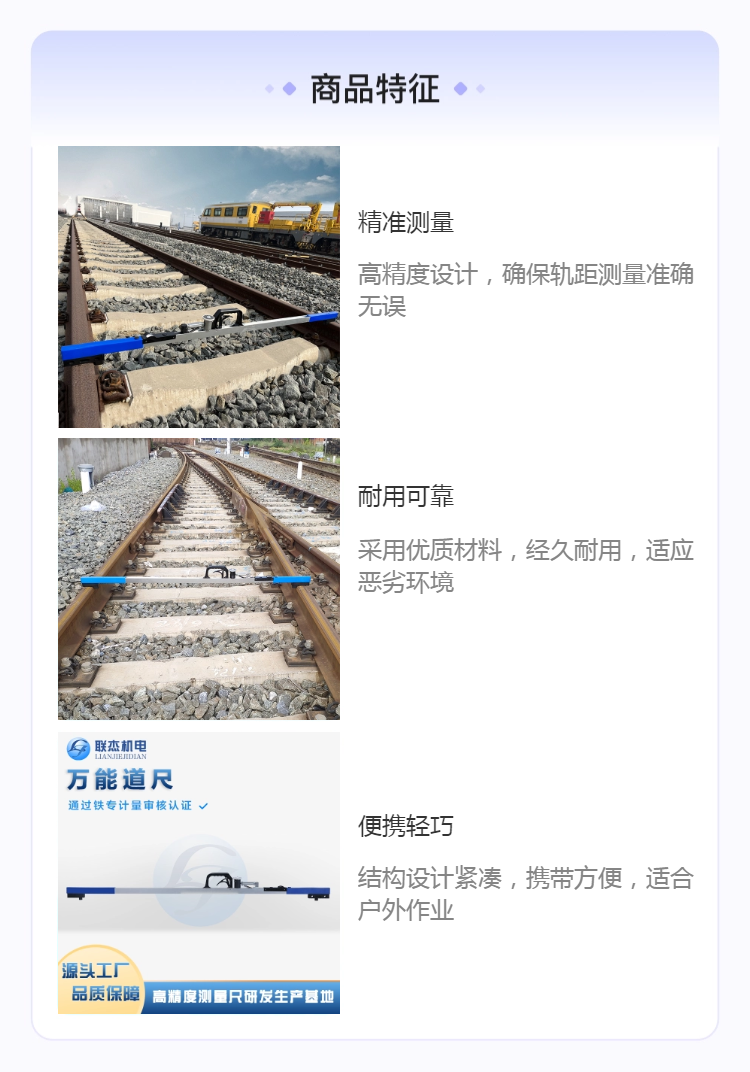 用途用于测量铁路线两股钢轨间的轨距、水平度以及超高值等轨道线路指标,是铁路施工、养路的必备工具