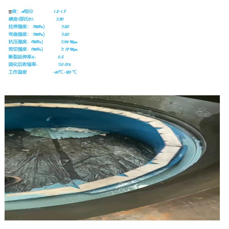 清除锥体表面残余填充料,和与胶接触部位油污,脏物;装合锥体和衬板;用胶带等封住锥体/衬板配合面和环孔,以防漏胶,必要时保护轴上的螺纹;使用时尽量在10℃-30℃施工,冬季施工最好将A组分单独加热到20℃-30℃以降低粘度便于浇注。为便于下次拆卸,锥体和衬板表面可预涂适量机油或脱模剂。夏季温度大于30℃时,应减少一次浇筑量,每次浇筑不大于五桶配胶量,每次浇筑时间间隔不小于40分钟。针对于不同浇筑体积不同温度下的浇筑操作,可做出调整。避免出现一次性浇筑量过大,胶液反应过快放热过多而造成鼓泡,收缩脱离,出现裂缝 b等不良现象的出现。