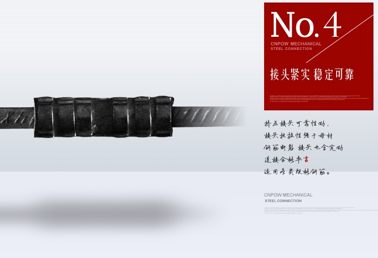 钢筋冷挤压连接是将待连接钢筋插入挤压套筒中,用挤压钳挤压套筒,使之产生塑性变形与带肋的钢筋表面紧密压合形成的接头。该技术与传统的搭接、焊接技术相比具有接头质量稳定可靠,不受环境影响,可全天侯施工,接头抗震性、耐低温性好等优点。中动冷挤压设备由超高压泵站,高压油管和挤压钳,压模配套使用,共同完成挤压连接。