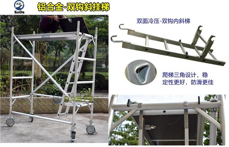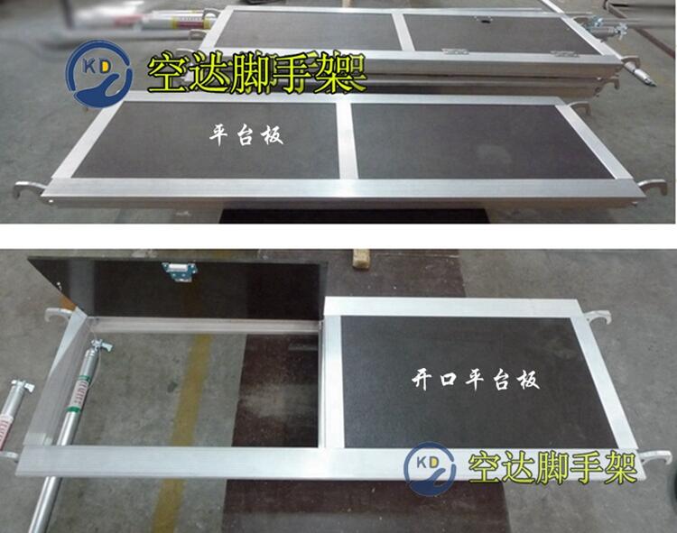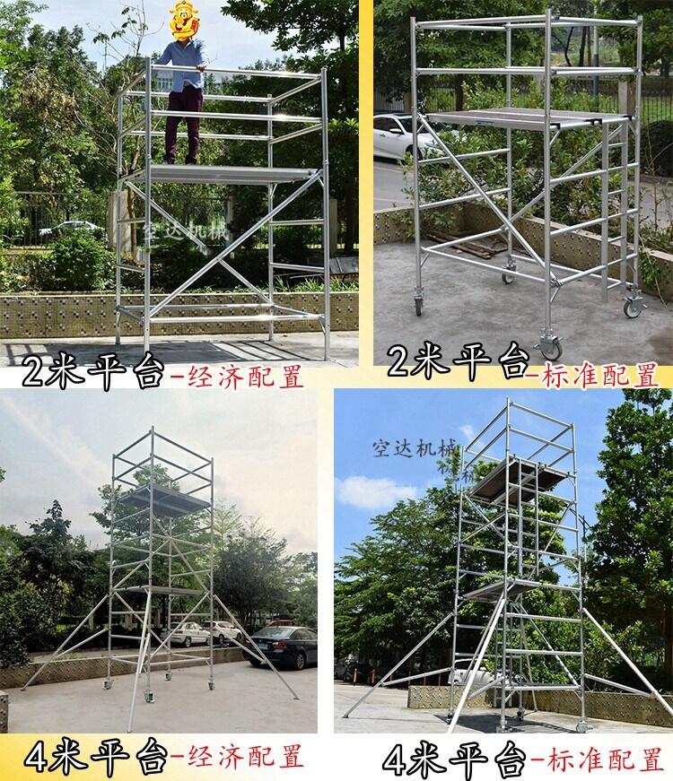 3、 有防护栏。传统脚手架很多时候作业没考虑安全性,很多时候施工人员站在脚手架的顶端作业,并没有安全防护栏,不佩戴安全带,施工人员施工中不小心踏空时有发生,造成很大的安全隐患。铝合金脚手架安全标配是有防护栏,站人平台位置要高出约1米的高度作为防护栏。还有更高的安全措施是脚踢板的防护,脚踢板作为脚手架的四个面围着施工人员,防止施工人员踏空和施工中小工具掉落脚手架。