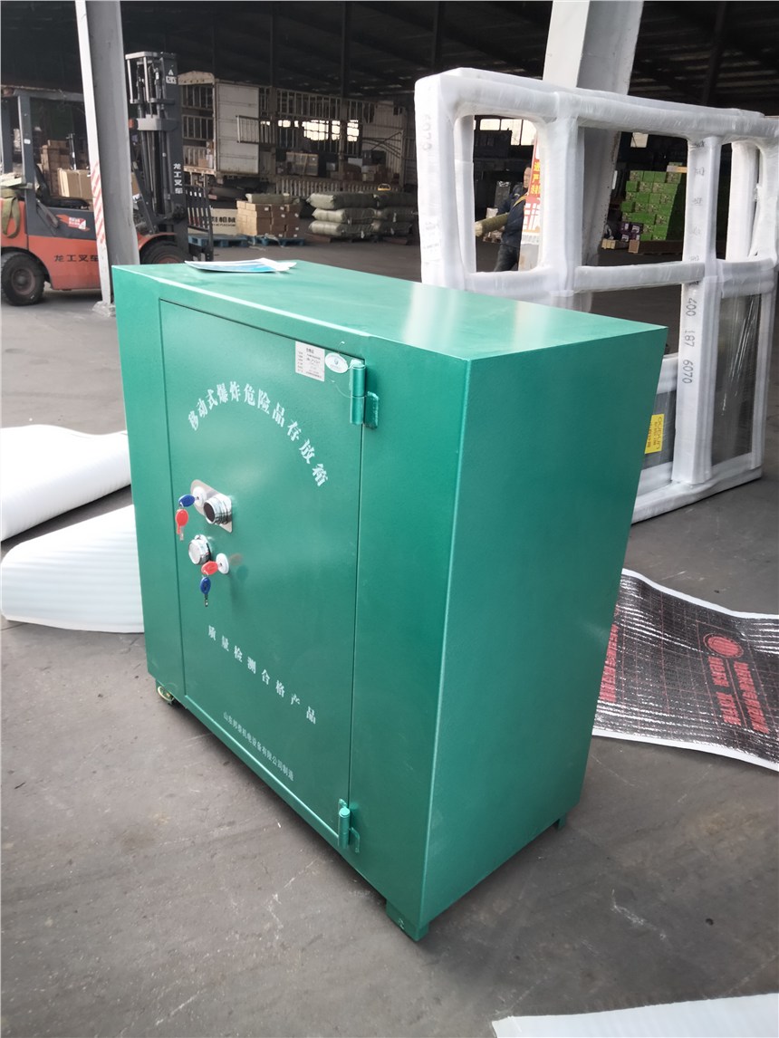 经由道路运输民用爆炸物品的一款专用存放柜,也叫移动式民爆物品存放柜,可固定放在存取处,也可放置于车上,用于车载式运输,由于存放物品性质的特殊性,对存放柜是有严格要求的,具有防爆,防静电,防盗等特性,材质组成分别是钢板+绝缘木板+防静电毡垫,由于外层钢板厚度要求不得低于6mm,柜体坚硬,不易变形,有效防护民爆物品的存放安全,门板上安装有两把十字机械锁和一个密码锁,钥匙由专业人员存放。