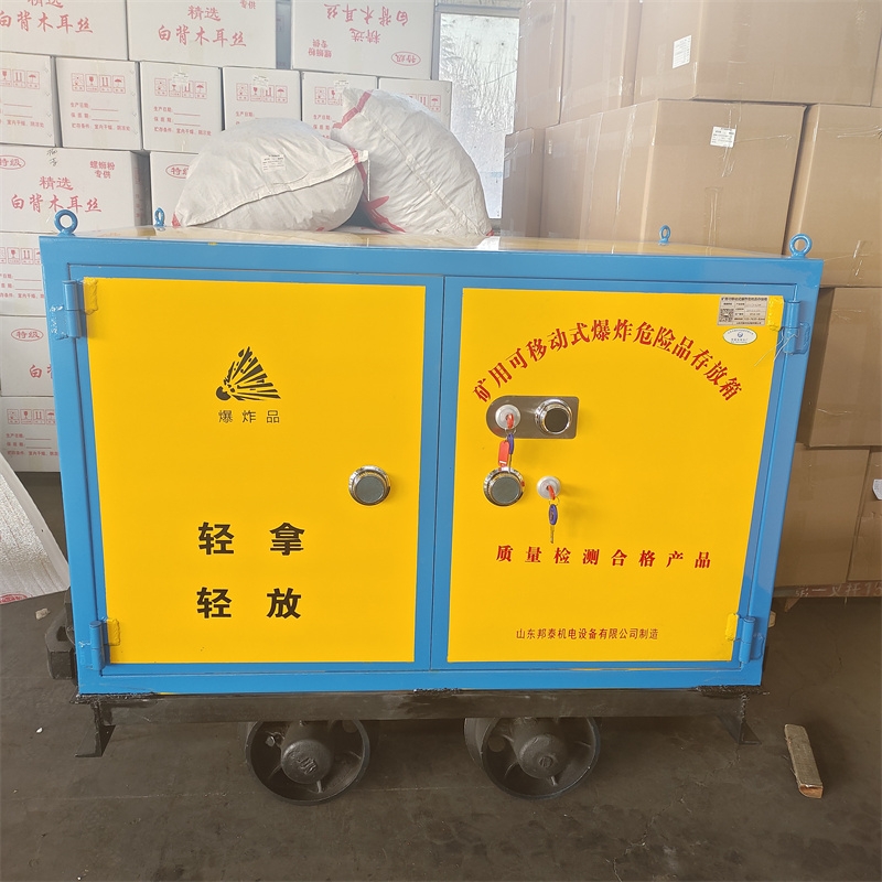 山东邦泰集团根据长年与矿企的合作,按其实际需求制造的有轨式矿车Z药箱,是由两个部分组合而成,下部分是行驶主体的材料车底盘,可根据矿山实际轨距来选择,通常为600/762/900这几种轨距;上部分是危险品存放柜体,是采用优质钢板材质焊接而成的,钢板厚度不低于6mm,钢板内部是绝缘木板和防静电阻燃毡垫,满足于防爆,防静电的存放条件,门板装有密码锁和两把明锁,可实现双锁联动,具有很好的防盗作用。