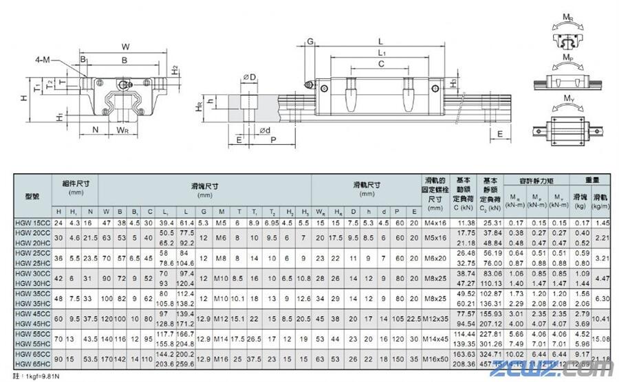 HGW25HC滑块上银HIWIN直线导轨HG系列尺寸规格参数