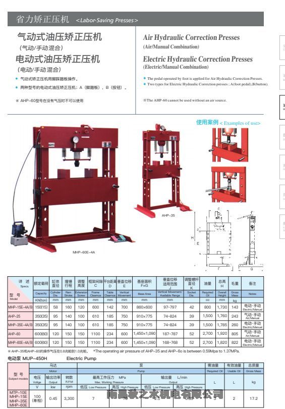 電動ポンプで操作出来る油圧プレスです。手動式ポンプが併用でき、微調整が簡単です。