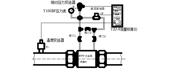 标准型BYWZJ型亚音速—音速文丘里流量计由BYW流量传感器、绝对压力变送器、差压变送器、温度变送器和YZJ-9系列流量积算仪等配套组成,如图2所示。