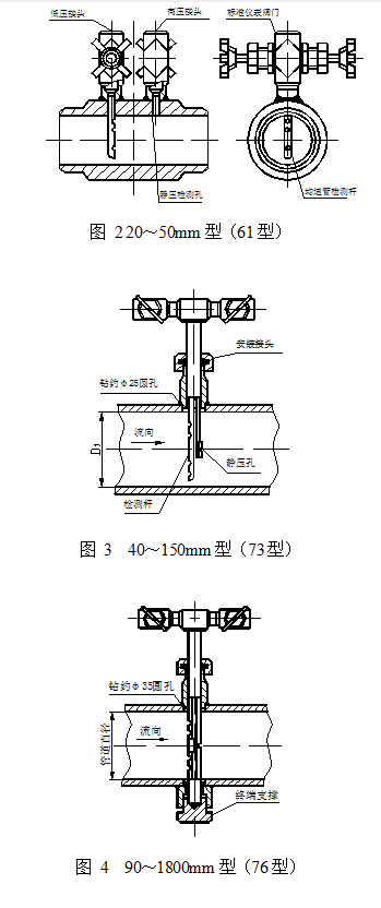 2.2 均速管流量计由传感器、引压附件和差压变送器、压力变送器、流量积算仪等配套组成,我公司可生产LGZ-(20~50)mm (61型)、LGZ-(40~150)mm (73型)和LGZ-(90~1800)mm(76型),安装结构形式分别如图2、图3和图4所示: