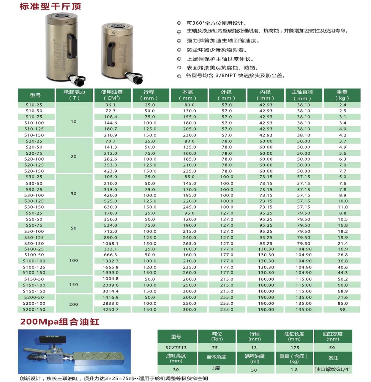 单作用大吨位油缸是特别为举升和维修而设计,可选配倾斜底座以减轻侧压的损 坏风险,程限制安全阀保证了活塞只能伸展到其额定行程长度。