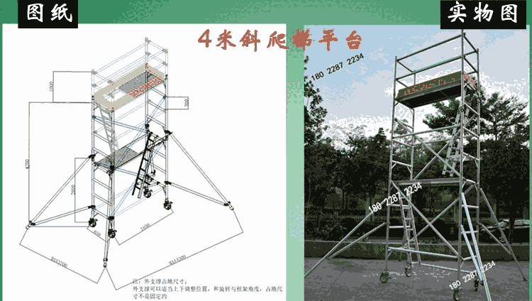 移动式铝合金组合脚手架是新型高空作业平台,设计合理,工艺独特,以其牢固、便捷、高效的显著特点,维修行业得到广泛应用,有重量轻,搭建拆卸简单快捷,结构稳固、移动方便、耐锈蚀等突出特点。