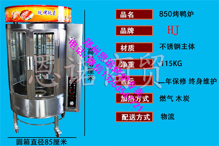 850型烤鸭炉产品特点: 1、 本机主体采用进口不锈钢制造,配备透明玻璃装置,造型美观方。 2、 采用旋钮电子打火开关,独特设计,操作简便。 3、 采用红外线陶瓷板和耐热金属网组成红外线燃烧器,火焰燃烧更加均匀,安全可靠无异味。使用燃气比电烤能源消耗低35%,节约能源。 4、 可选用燃气:液化气(LPG) 5、 炉体内部采用辐射加热和对流换热原理,以旋转方式烤制,再加上独特的配方和讲究的烤制方法,从而使烤制的制品均匀受热、皮色黄、外酥里 嫩、香气诱人,食之令人回味无穷。 6、 气炭两用,烤制非常均匀,不需要上下翻动,节约时间。