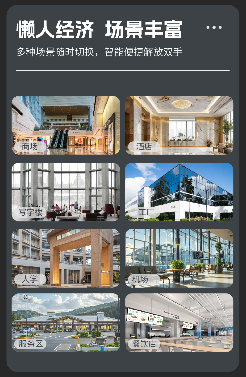 适用范围商场、学校、加油站、充电站、服务区、写字楼、酒店、连锁便利店等
