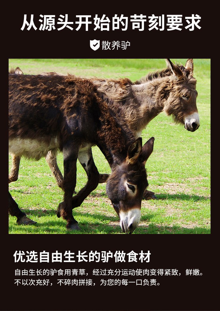 驴肉中除含有蛋白质、脂肪外还有含氮浸出物,这些物质不仅能增进食欲,而且能增加肉的香味和味道。驴肉中碳水化合物以糖原为主一般不足1%,还含有少量的葡萄糖和麦芽糖。驴肉中无机盐及微量元素总量约在1%左右,主要有硫、钾、磷、钠、氯、镁、钙、铁、锌等,其中以钾、磷、硫、钠的含量较多。