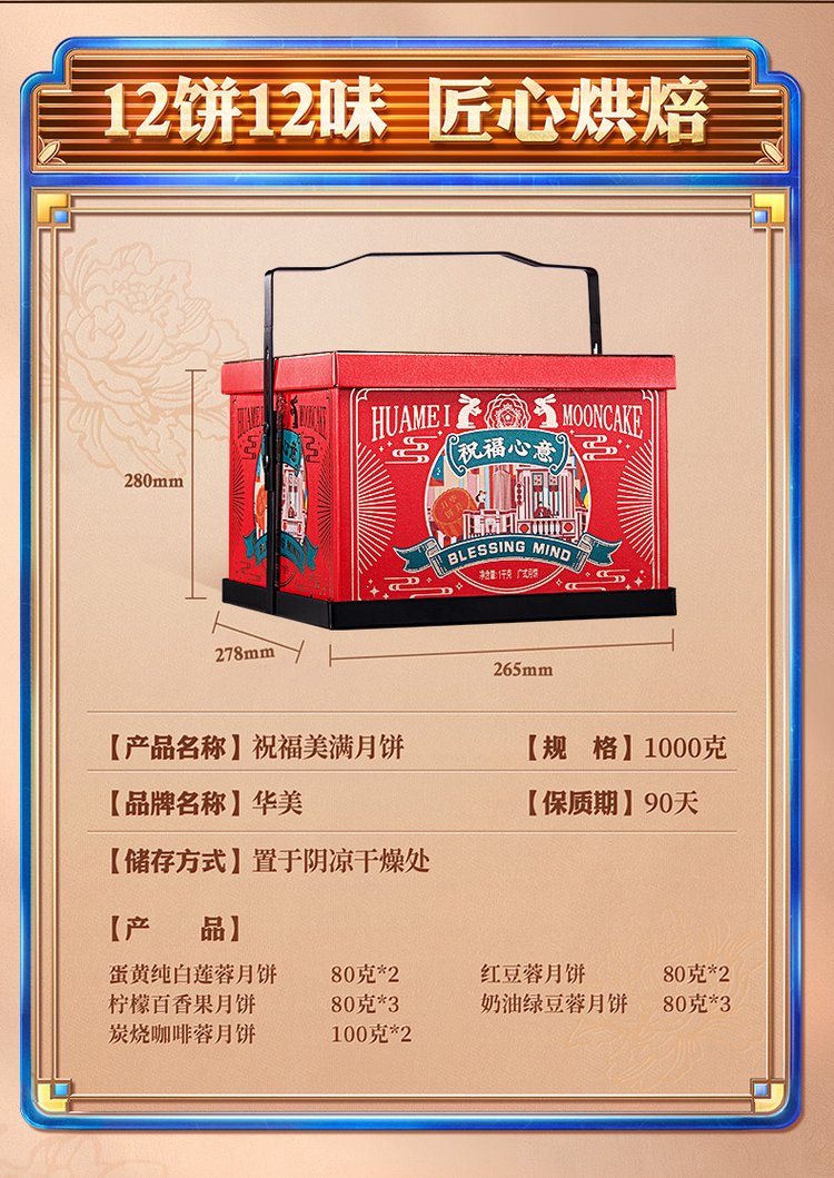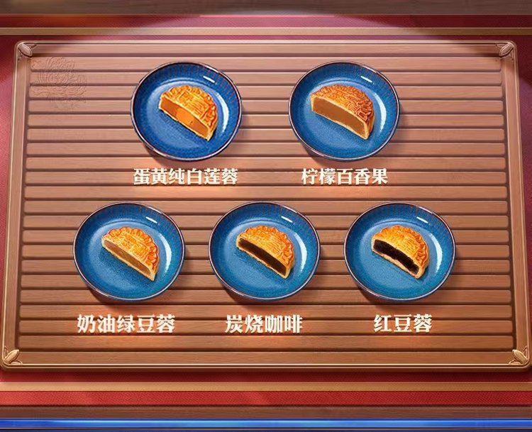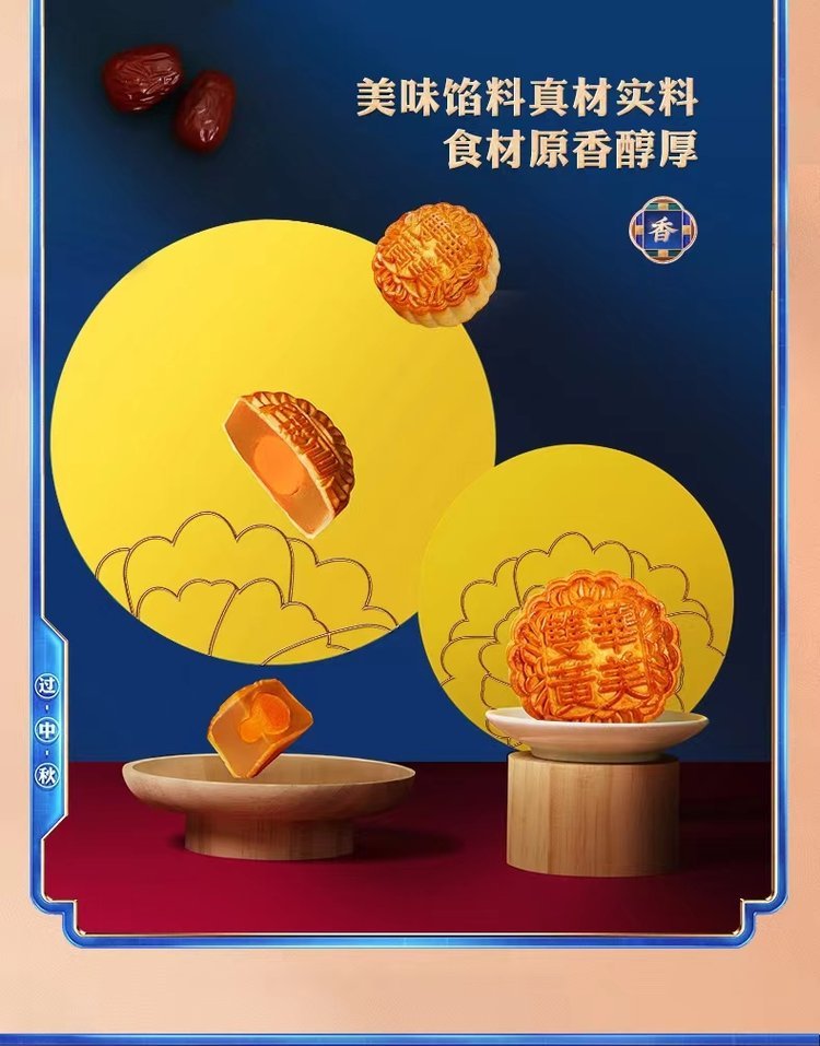 内配规格 | 蛋黄纯白莲蓉月饼 80克*2 红豆蓉月饼 80克*2 柠檬百香果月饼 80克*3 奶油绿豆蓉月饼 80克*3 炭烧咖啡蓉月饼 100克*2 | ||