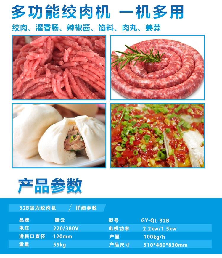 防水开关,二级减速,齿轮链条传动,接触食品部位全部不锈钢材质,配6mm、8mm刀网,两个十字刀,并配实心推料棒!绞肉就是不一样。