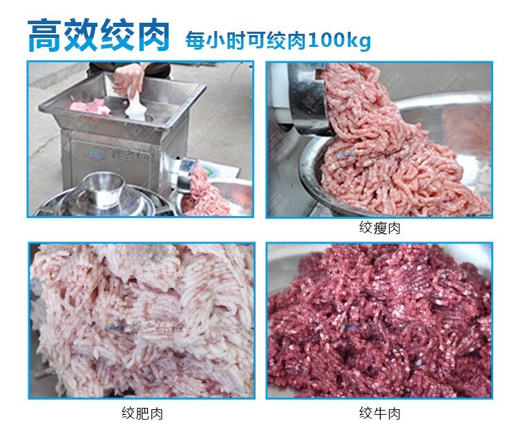 不锈钢绞肉机具有功率小效率高,大大减少人工劳动强度,完全模仿人工绞肉,口感完全是人工剁出来的口味等特点,刀具采用台湾专用刀具 是理想的肉馅加工设备,也是包子店,饺子,店饭店 酒店,连锁店理想的配套设备。 新型绞肉机模仿的是纯手工绞肉的原理,两把刀交替剁在肉板上的鲜肉,此设备解决了绞肉机绞肉时通过挤压出来的肉馅口感问题,可在短时间内把鲜肉绞成肉馅,电机为无级调速,可旋转机头,操作简单,省时省力,剁一次肉的时间在三分钟内,是肉店、饺子店、餐饮连锁店的首选设备。剁肉机所剁肉馅不仅保证了人工所绞肉馅的口感,同时也提高了工作效率。 赣云每一种产品都精工制作。专业质造15年,品质有保障。