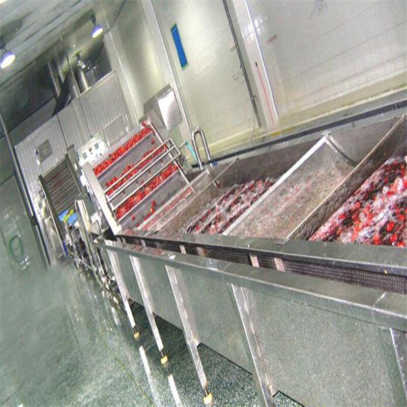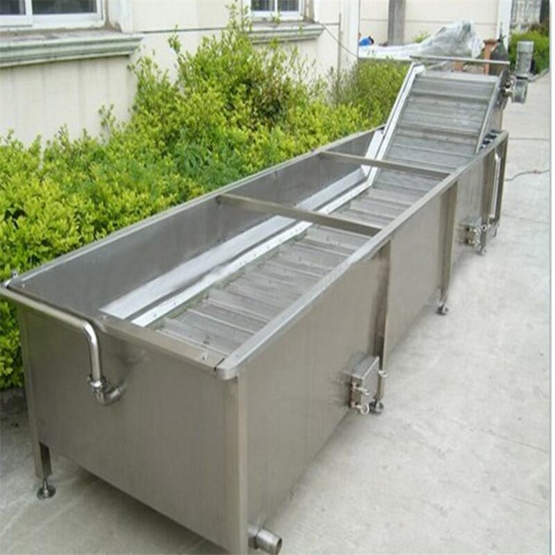 气泡发生清洗段,特设的布气方式,产生丰富的气泡,使物料呈翻滚状态,保证产品多面清洗,去除产品表面污垢、农残功效,同时根据需要可加入适量的药剂,进行消毒固色,漂浮物可以从溢流槽溢出,沉淀物从排污口排出,以达到清洗的目的。水淋清洗装置,水淋喷头直接接入自来水,将清洗、消毒后的产品彻底清洗干净。另:淋后的清水流回气泡清洗段,极大地提高了水的利用率。