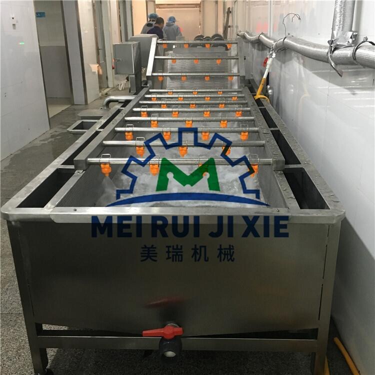 净菜加工流水线 生产酱菜加工流水线 蔬菜水果高压气泡清洗机通常采用网带/链板式输送,配有气泵高压漩涡气泵使水发生翻滚翻浪,气泵翻滚带动气流使蔬菜表面的尘土、泥沙迅速脱离主体,清洗能力大,洗净率高且不损伤物料,上侧有多道喷淋管达到一个达到一个喷淋加气泡的双重清洗功效,在出料端上部装有多个扇形喷嘴,对蔬菜进行二次清洗,无死角作业,达到良好的清洗效果。根据客户原料不同可进行一级二级三级等多级清洗,连续性好无需人工参与,广泛应用于水果、蔬菜、食用菌、海产品等行业的清洗深加工为一款可定制型设备,可以与漂烫或者分切等设备相组合形成流水线生产,达到自动化的运营的效果。