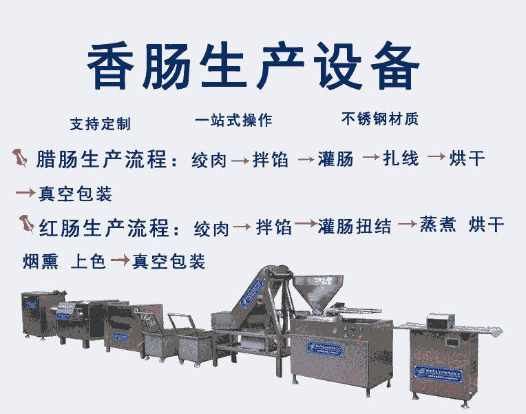 腊肠生产线 红肠生产线 全自动腊肠生产线选择要从绞肉开始等中间的各种设备都是要符合生产能力的,正好符合客户的生产时间就可以。如果是500公斤的,要将设备都算好产量,还有中间的工人操作时间,算上所有的设备和生产过程。跟灌肠机配套的设备一般有绞肉机、斩拌机、拌馅机、液压灌肠机、扎线机、烟熏炉、真空包装机等,一整条的灌肠生产线都可以根据您的生产要求进行搭配,欢迎您随时咨询我。