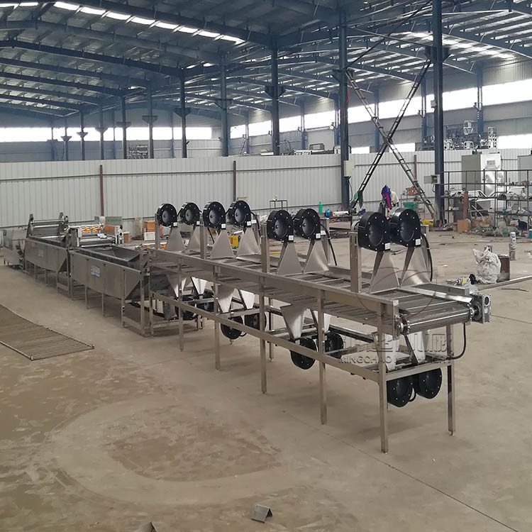 净菜加工流水线简介: 净菜加工项目是近几年兴起的一项新的产业,人们生活水平的提高和生活工作节奏的加快人,促使人们在蔬菜的选择上从以前的买菜自己清洗处理,逐步的被直接采购净菜所替代。净菜加工流水线原理: 国外及我国的较发达地区很多年前就有净菜加工这个项目,我国的消费者现在也普遍的认可了净菜的存在,工厂化处理的蔬菜无论从清洁程度还是细菌、微生物的存活都要比我们在家里自己清洗要高很多倍,净菜的加工经过数十道工序的处理,使蔬菜的灰尘,沙土都洗干净,经过臭氧清洗和漂烫的蔬菜会杀死蔬菜中的细菌,消费者可以放心的购买,食用。