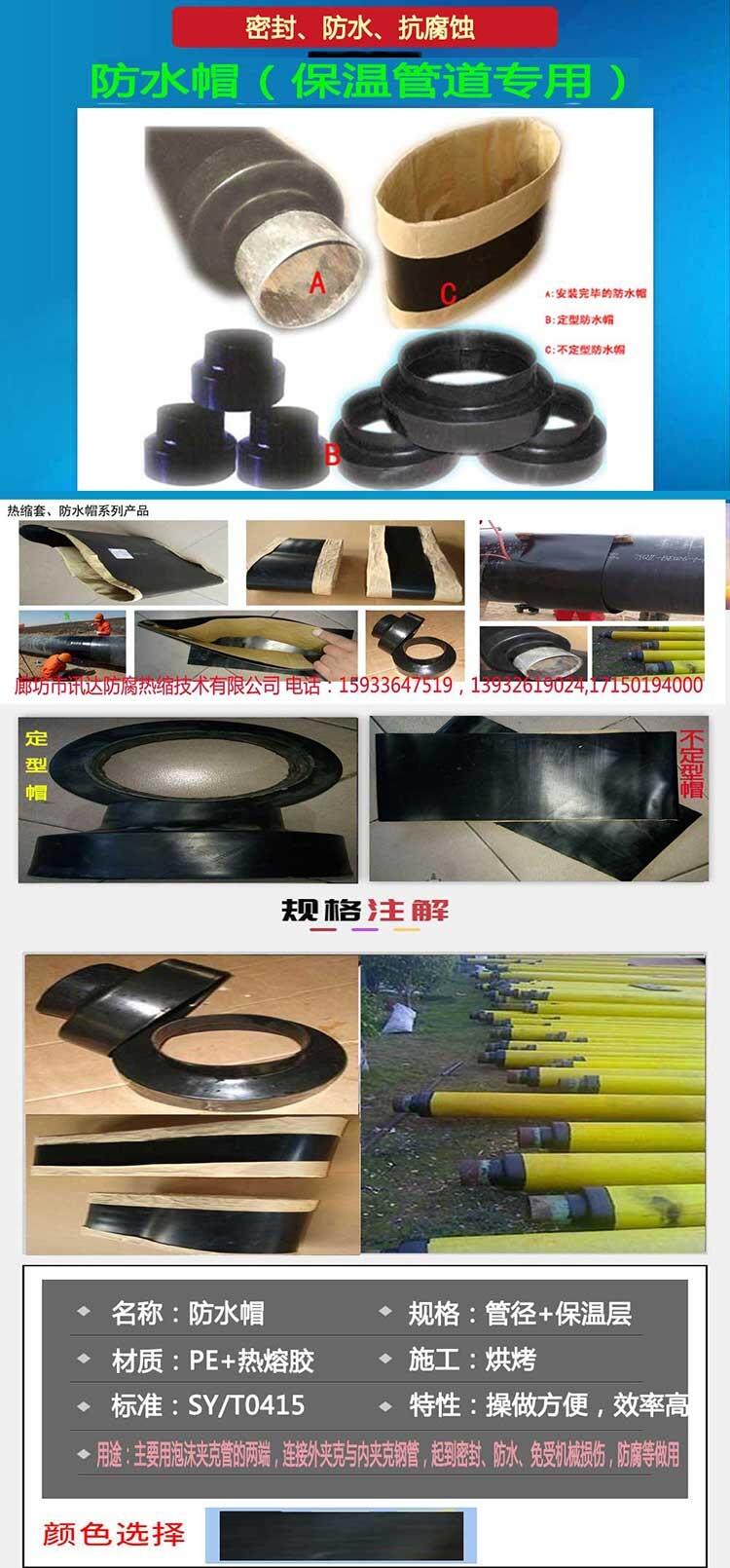 防水帽也称热缩帽,,是在辐照交联聚乙烯基材上复合热熔胶制成的。