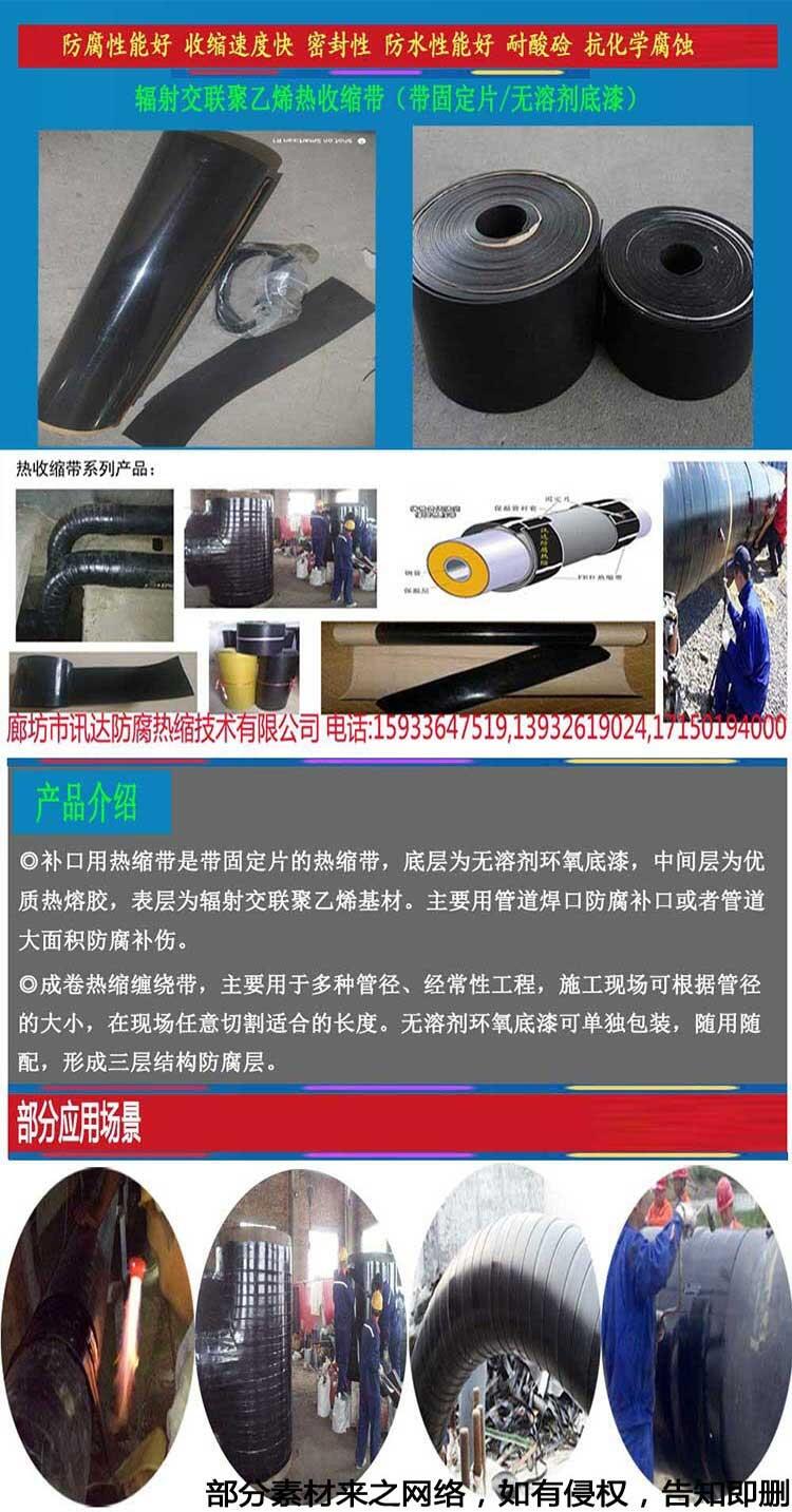 配合性能优异的热熔胶及底漆,  公司生产的热收缩带能适应不同的运行温度条件,抗蠕变性能好,寿命长能与管道同龄。